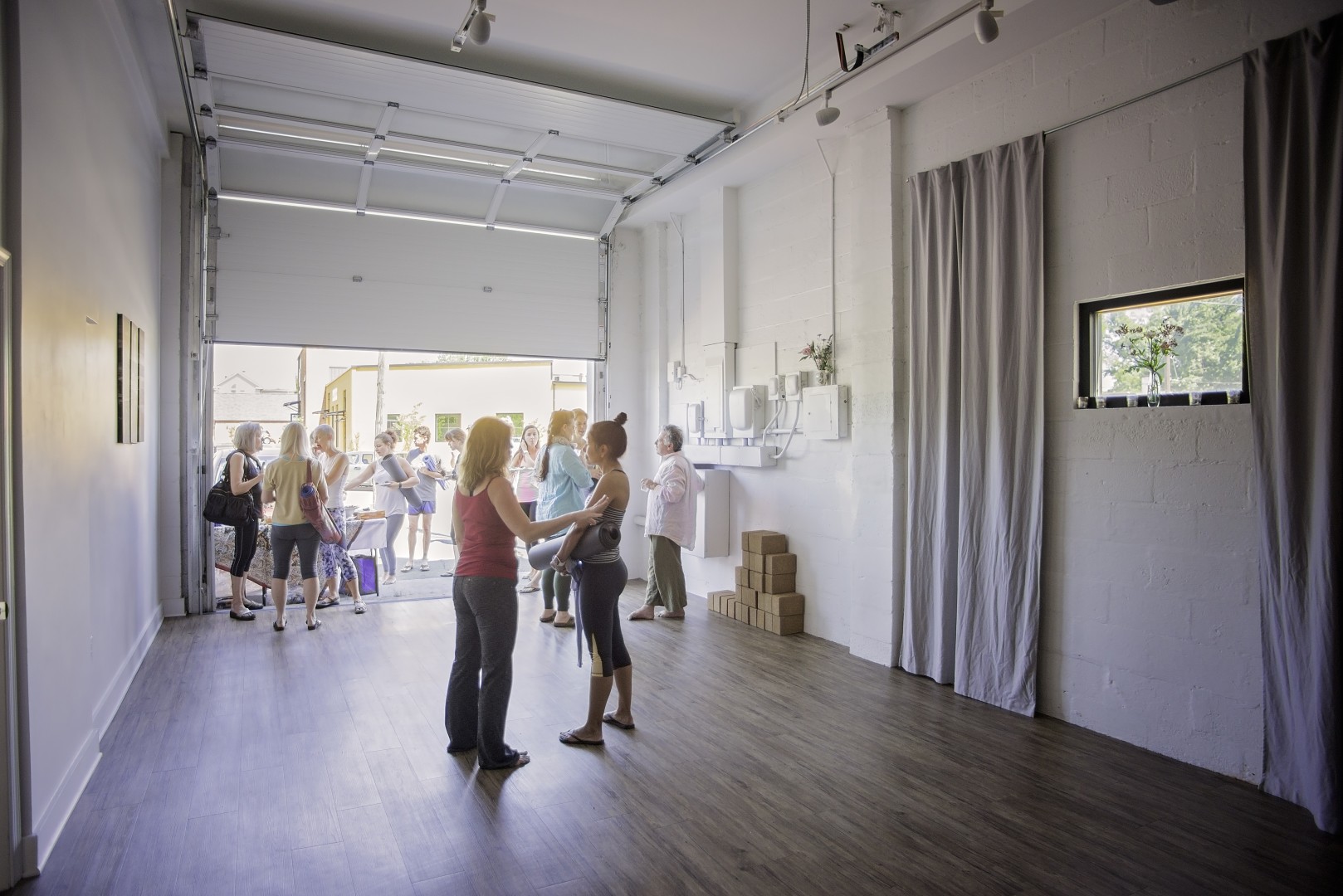 Chic, light-filled yoga studio with clean, inviting décor has two rentable spaces: one large, high-ceilinged room that accommodates up to 30 (on yoga mats) and a second smaller space with a bay door that opens onto an outdoor courtyard with deck and water feature. Capacity varies, according to use, but rental of the entire space (both studios and courtyard, weather accommodating), accommodates up to 75 mingling people comfortably. Wired sound system in the large studio and bluetooth system in the smaller studio. Wifi.