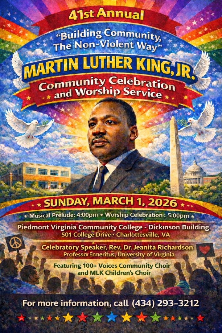The Annual Martin Luther King, Jr. Community Celebration in Charlottesville, VA, is celebrating its 41st anniversary on March 1, 2026 at PVCC Dickinson Theater. There is a Prelude Show from 4-5 pm, with the Celebration beginning at 5 pm. (This is rescheduled due to the winter storms)