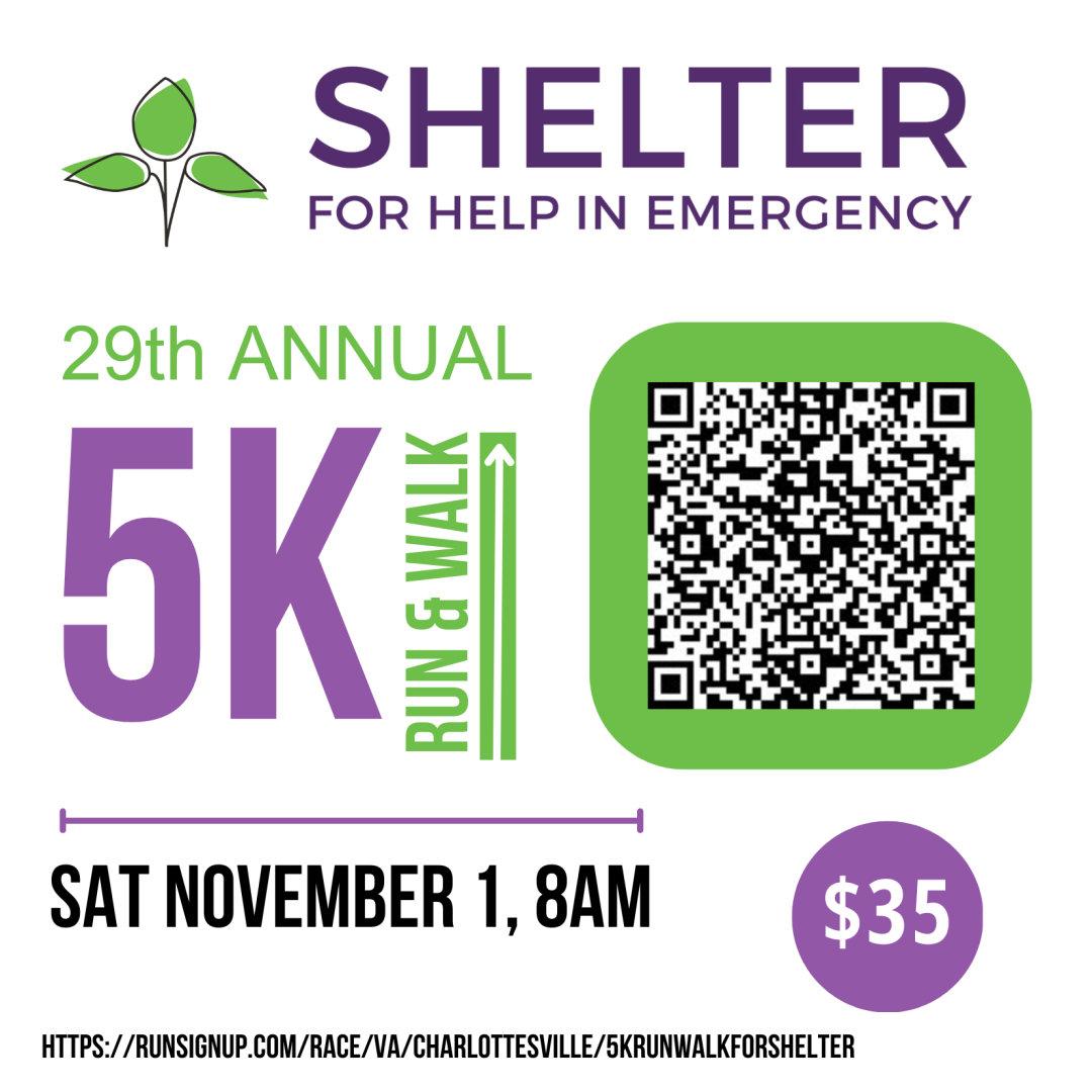 Join the Shelter for Help in Emergency (SHE) for our 29th annual 5k Run/Walk for Shelter. SHE provides free comprehensive, trauma-informed services to victims/survivors of domestic/intimate partner violence within the greater Charlottesville area. Services include a 24-hr crisis hotline, emergency shelter, legal advocacy, advocacy, and support. We also work with are youth on prevention programming that focuses on topics such as healthy relationships, boundaries, and consent.
