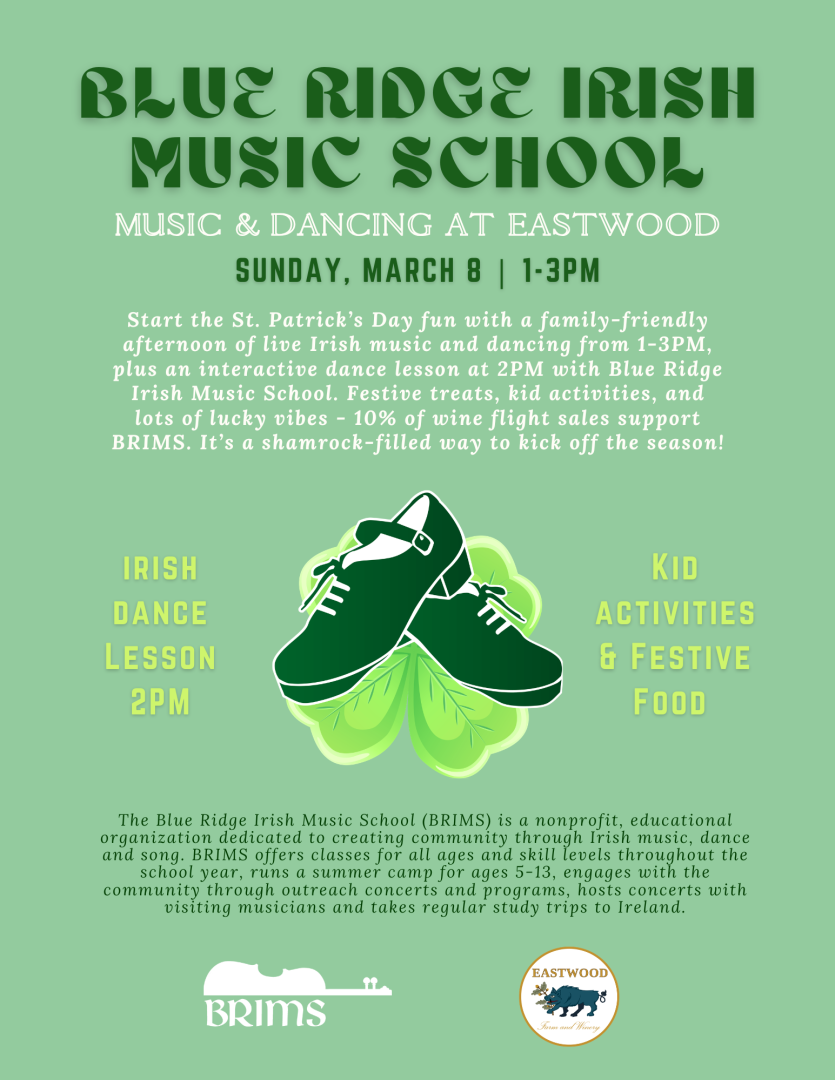 Start the St. Patrick’s Day fun with a family-friendly afternoon of live Irish music and dancing from 1-3PM, plus an interactive dance lesson at 2PM with Blue Ridge Irish Music School. Festive treats, kid activities, and lots of lucky vibes - 10% of wine flight sales support BRIMS. It’s a shamrock-filled way to kick off the season!