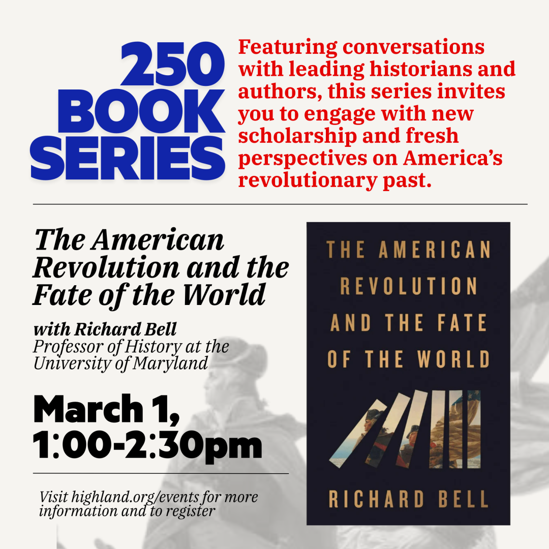As part of Highland’s celebration of America’s 250th birthday, please join us at Highland on March 1st from 1:00 to 2:30 p.m. for a conversation with author Richard Bell about his new and timely book, The American Revolution and the Fate of the World. In it, Bell widens the lens on the Revolution, revealing the “War of Independence” as a sprawling struggle that upended the lives of millions of people on every continent and fundamentally transformed the way the world worked. The result is an unforgettable new perspective on America’s founding fight that shifts everything we thought we knew about our creation story.