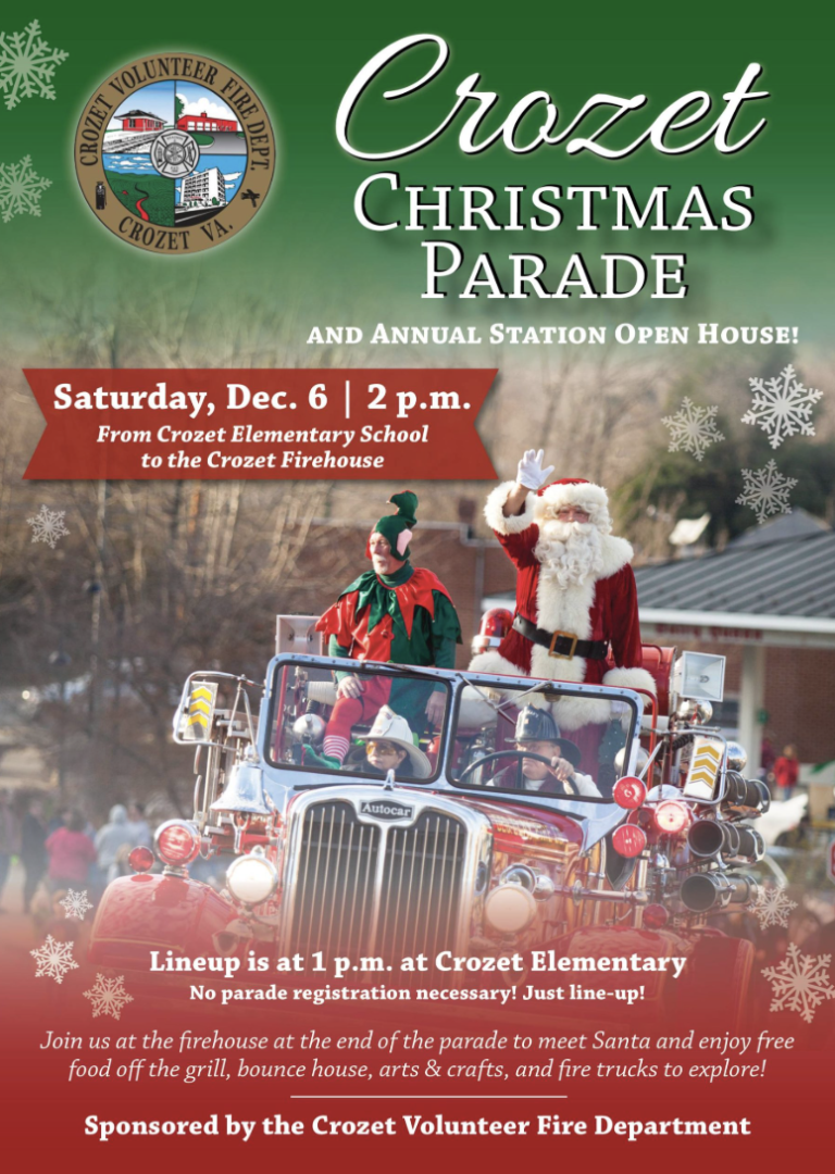 The parade route will begin at Crozet Elementary and end at the Firehouse. Line up will be at 1PM at the Crozet Elementary School. You do not need to register to be in the parade. Just come to line up.