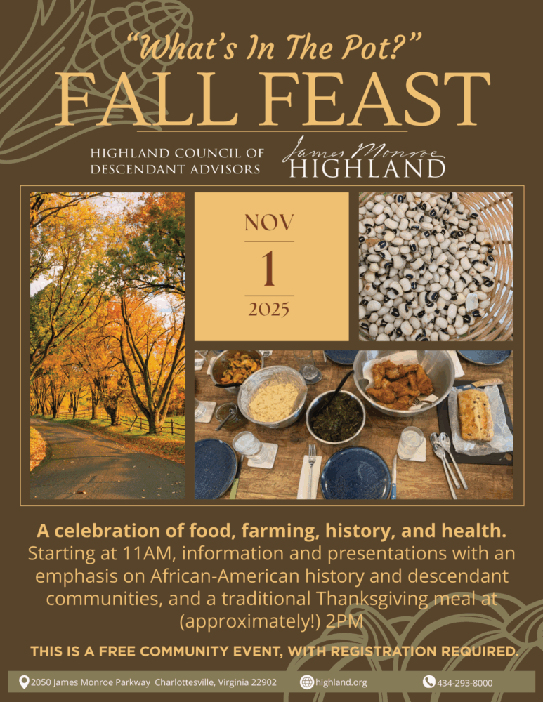 Join us on Saturday, November 1, for Fall Feast, a celebration of African American food, farming, history, and health. Discussions and health information starting at 11:00 a.m., followed by a traditional Thanksgiving meal at 2:00 p.m. This event is hosted by Highland’s Council of Descendant Advisors.