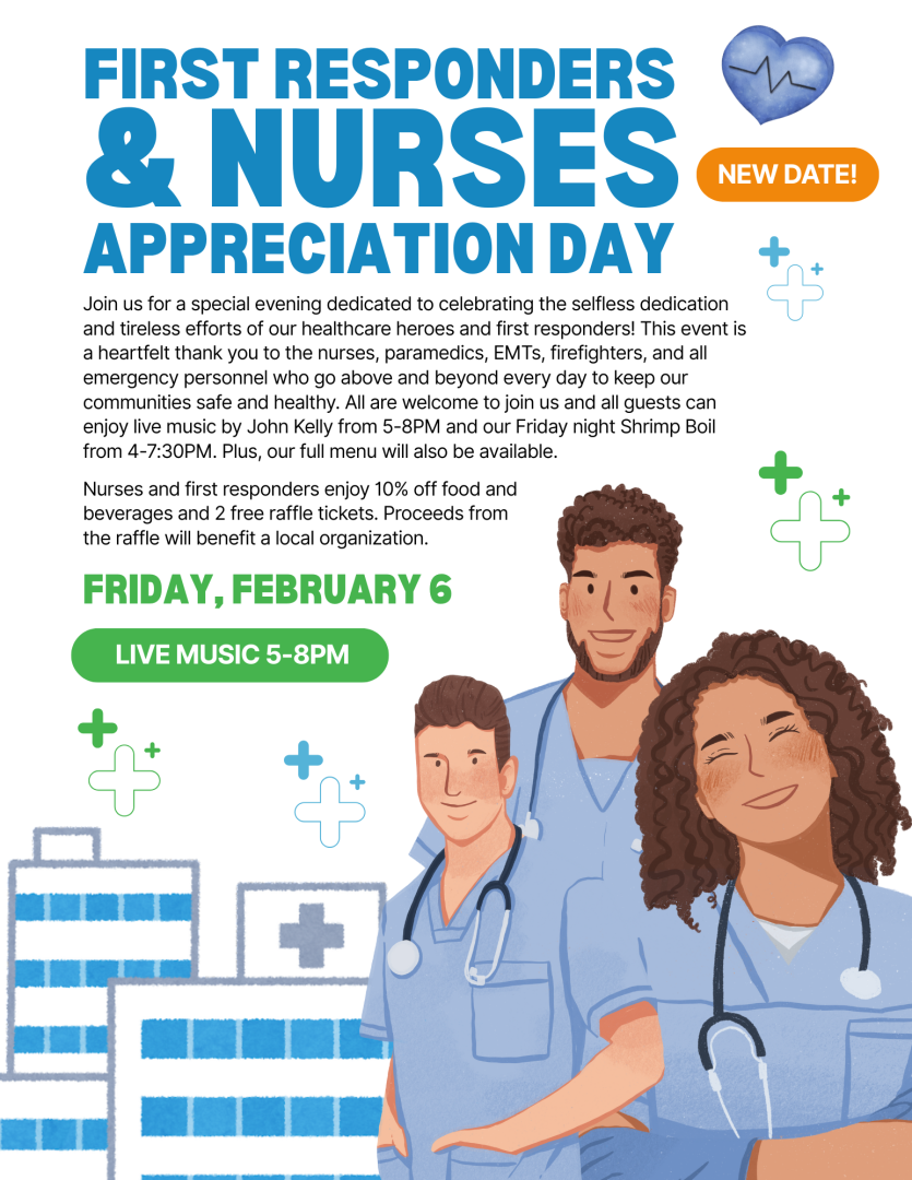 Join us for a special evening dedicated to celebrating the selfless dedication and tireless efforts of our healthcare heroes and first responders! This event is a heartfelt thank you to the nurses, paramedics, EMTs, firefighters, and all emergency personnel who go above and beyond every day to keep our communities safe and healthy. All are welcome to join us and all guests can enjoy live music by John Kelly from 5-8PM and our Friday night Shrimp Boil from 4-7:30PM. Plus, our full menu will also be available.