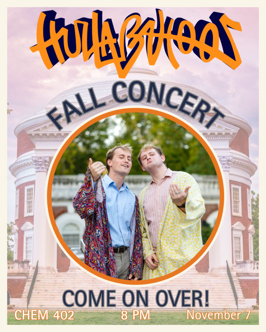 This is an annual concert put on by the Hullabahoos, taking place at UVA’s Chemistry Building at 8pm on Friday, 11/7. The 11-song setlist comprised of contemporary and oldie hits will be supplemented by an introduction video, intermission skits, and interludes performed by group members. 450 guests are expected.