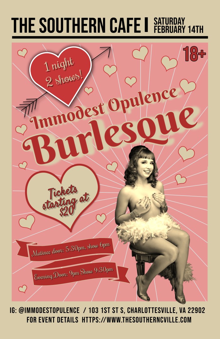 Make a date for Immodest Opulence: Burlesque Valentine’s Day Edition on Saturday, February 14 at The Southern Cafe and Music Hall. Join us for a night of burlesque that mixes glamour, humor, and plenty of heat, all in the spirit of Valentine’s Day. Whether you’re celebrating passion, independence, or just leaning into a little flirtation, this show delivers bold performances and memorable moments without taking itself too seriously. It’s a great way to kick off your Valentines or Galentines with friends, a date, or whoever you want by your side. Either way, expect sparks to fly and hearts to race!