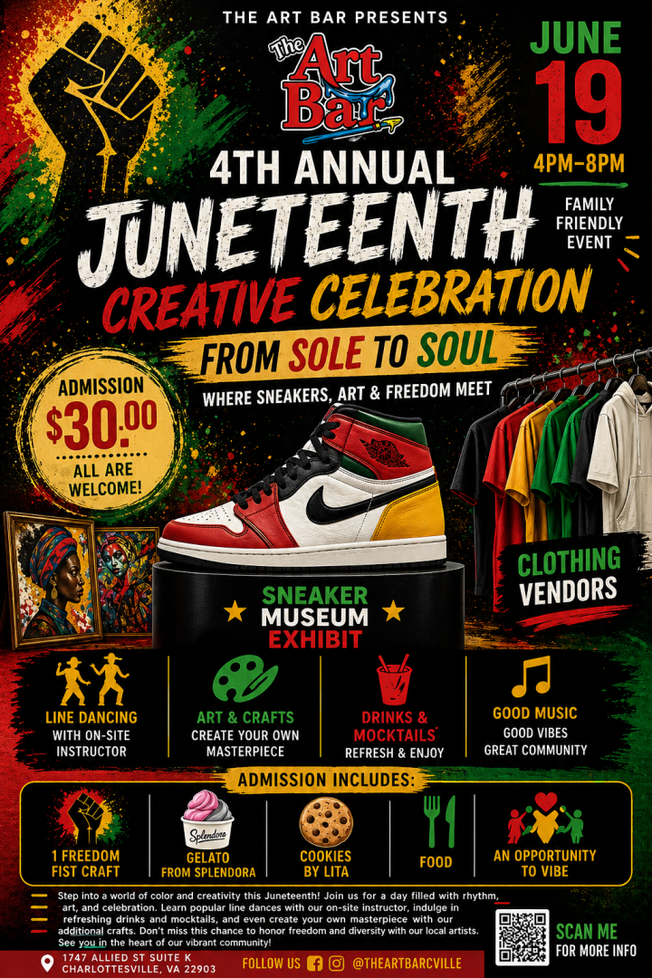 "Step into a world of color and creativity this Juneteenth! Join us for a day filled with rhythm, art, and celebration. Learn popular line dances with our on-site instructor, indulge in refreshing drinks and mocktails, and even create your own masterpiece with our additional crafts. Don't miss this chance to honor freedom and diversity with our local artists. See you in the heart of our vibrant community!"