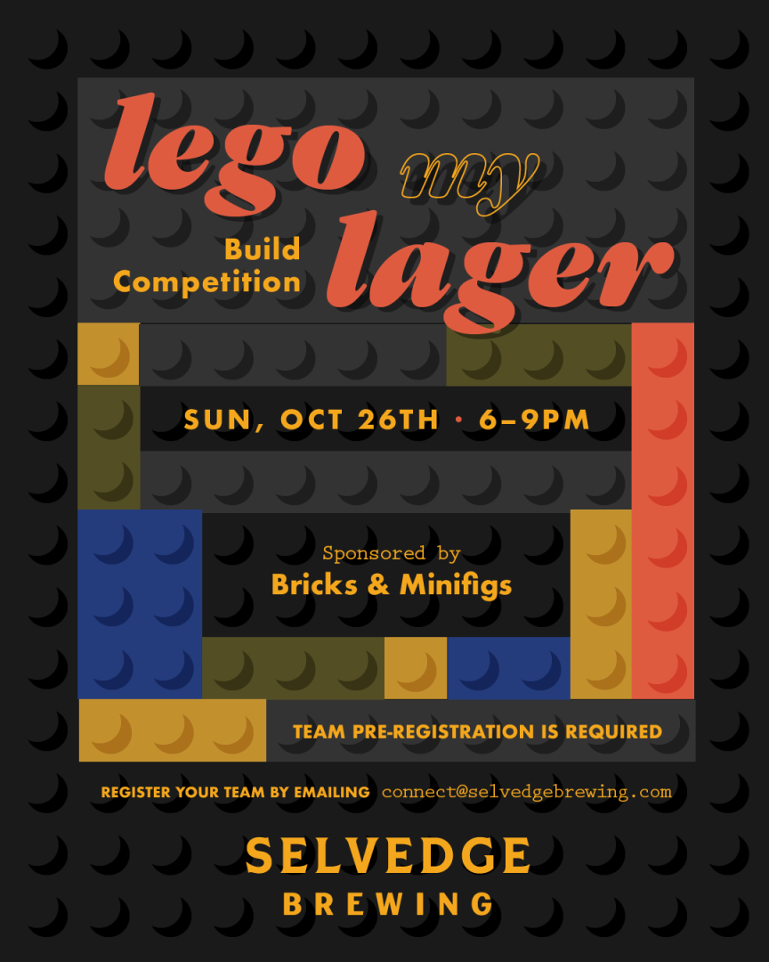 No need to bring your own bricks— Bricks & Minifigs will provide all the Lego we’ll need! Teams will have two hours to build, and at the end, our panel of judges will vote on the most creative, impressive, and theme-worthy designs. Winners take home prizes, and, of course, bragging rights. Email connect@selvedgebrewing.com to register your team of 6. Registration is limited so reserve your spot today!