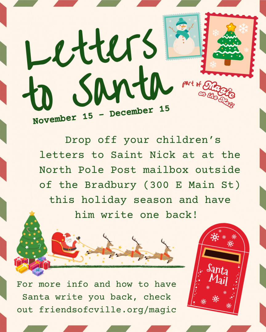 Drop off your children’s letters to Saint Nick at at the North Pole Post mailbox outside of the Bradbury (300 E Main St) this holiday season and have him write one back!