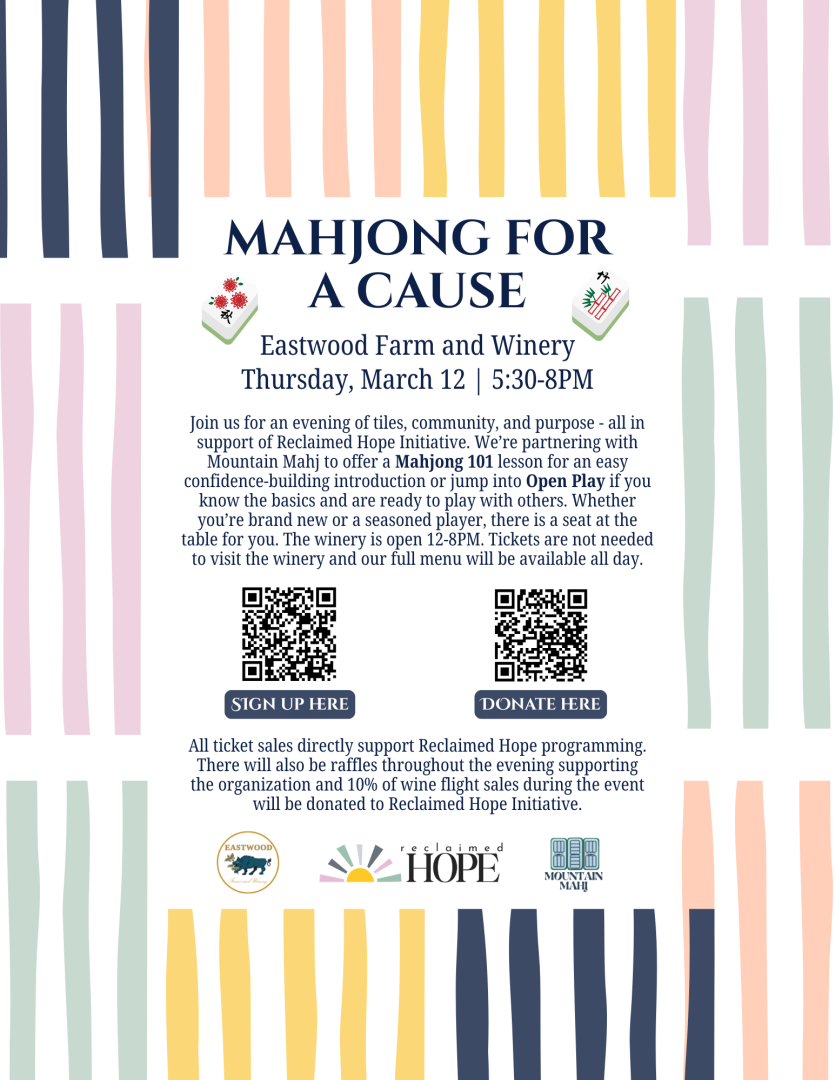 Join us for an evening of tiles, community, and purpose - all in support of Reclaimed Hope Initiative. We’re partnering with Mountain Mahj to offer a Mahjong 101 lesson for an easy confidence-building introduction or jump into Open Play if you know the basics and are ready to play with others.