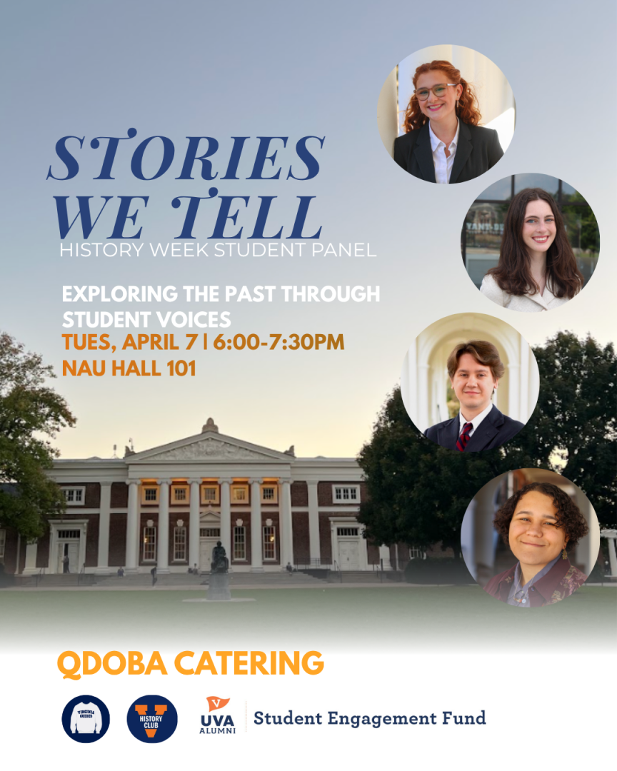 Hosted by the Virginia Guide Service and the UVA History Club, Stories We Tell is a student speaker showcase celebrating the launch of UVA's first-ever Public History Week (April 6–11). Fourth-year History Distinguished Major student Rob Martin, third-year historian and Monticello interpreter Reuben Spencer, fourth-year History and Latin American Studies major Isabella Shealy, and first-year Architecture student Rebekah Langford will each present original research spanning a wide range of historical topics, from William Walker's 1855 filibuster in Nicaragua to architectural history in the American South. Whether you're a history enthusiast or simply curious about the stories hiding in plain sight around Grounds, this is a unique opportunity to see student-driven public history in action.