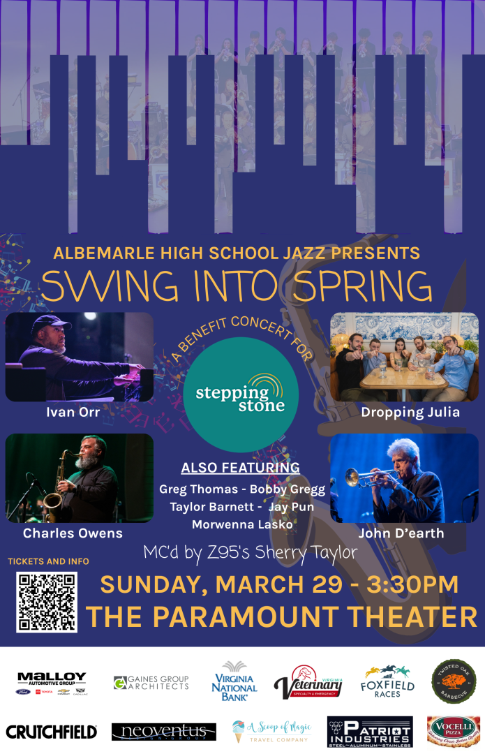Albemarle High School (AHS) Jazz Ensemble “Swing Into Spring” Benefit Concert returns to The Paramount on Sunday, March 29, 2026, at 3:30PM, featuring the national award-winning Albemarle HS Jazz Band and an all-star lineup of the area’s top professional musicians sitting in with the ensemble. This event is designed as a benefit for the band to give back to the Charlottesville community. This year, the band will feature unique performances from Dropping Julia, Ivan Orr, Greg Thomas, Taylor Barnett, Bobby Gregg, Charles Owens, John D’Earth, Jay Pun, and Morwenna Lasko! The event will once again be hosted by Z95’s Sherry Taylor. The concert will raise $5,000 for local non-profit Stepping Stone.