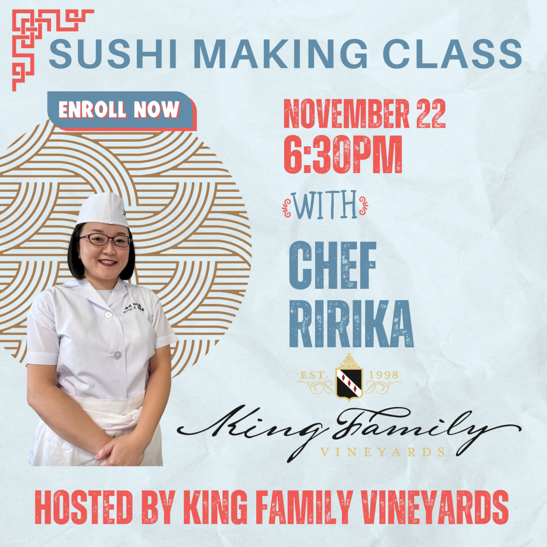 Join us for an unforgettable evening of culinary creativity and fine wine at King Family Winery. Under the guidance of Chef Ririka, a classically trained sushi chef from Yokohama, Japan, you’ll learn the art and fundamentals of sushi making in a hands-on class designed for all skill levels.