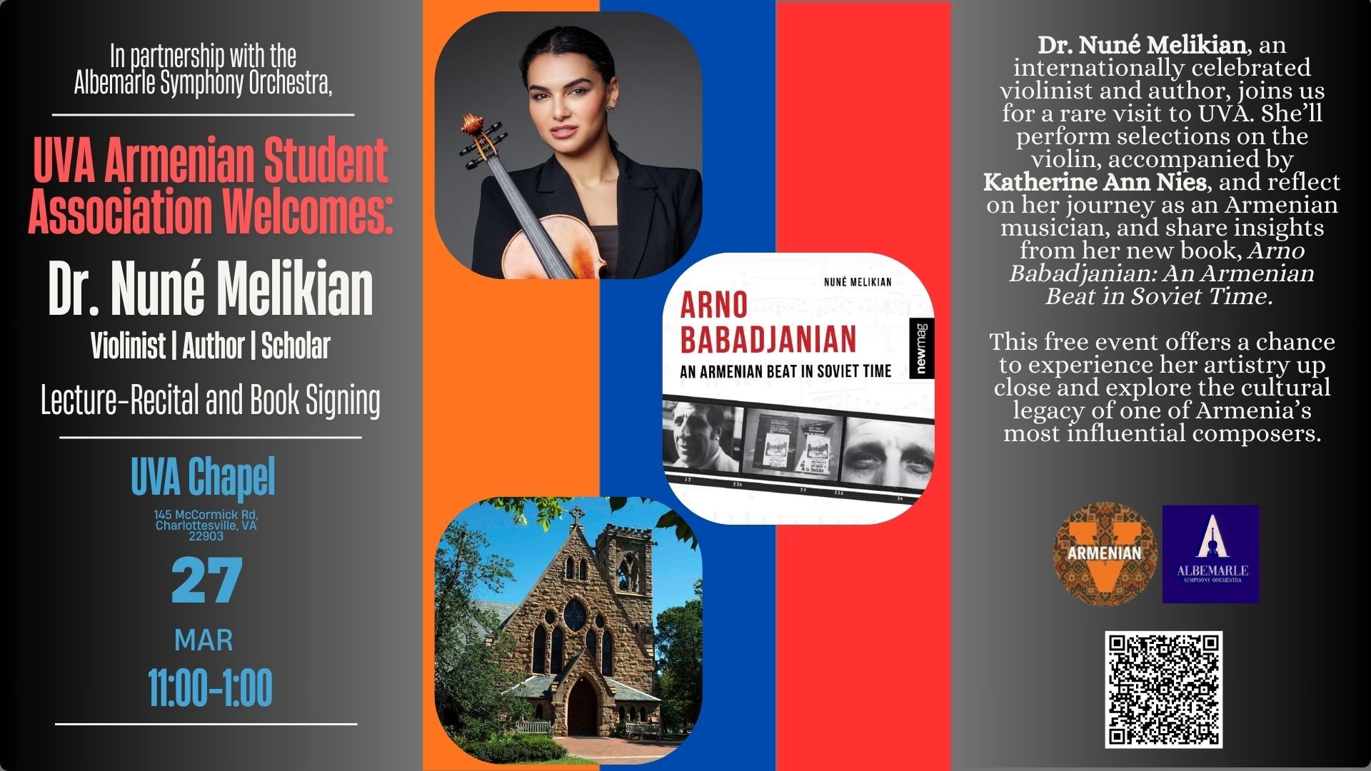 Dr. Nuné Melikian—renowned violinist and author—will give an exclusive preview of her upcoming performance with the Albemarle Symphony Orchestra, featuring Arno Babadjanian’s compelling Violin Concerto. During this pre-concert event, Dr. Melikian will discuss how Armenian identity, music, and Soviet cultural history intersect, and will introduce her new book, Arno Babadjanian: An Armenian Beat in Soviet Time.