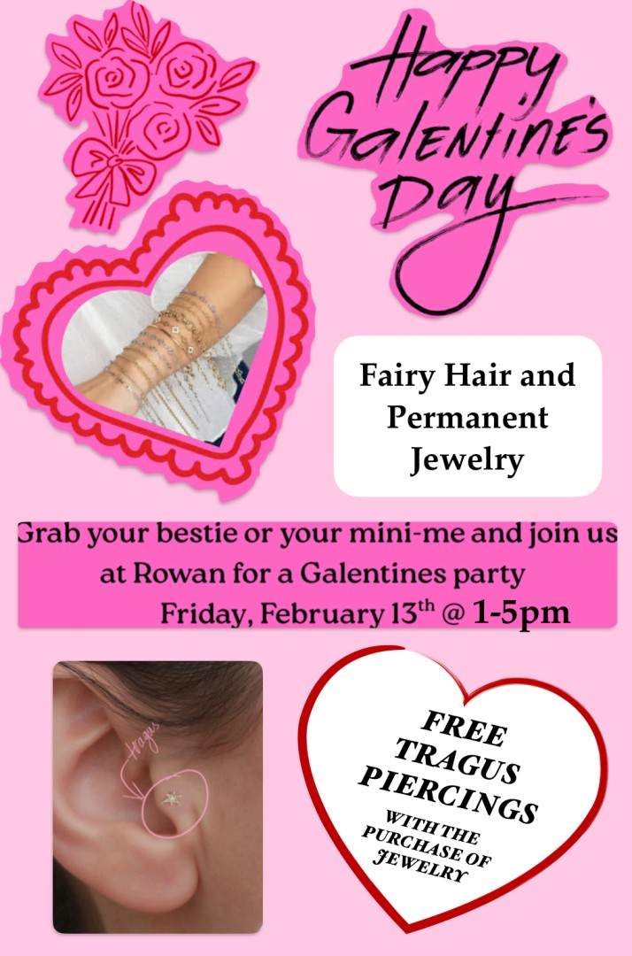 Come and enjoy Valentine’s Day themed items and activities. Permanent jewelry and fairy hair will be available for purchase. We are also offering free tragus piercings with the purchase of jewelry! We will have plenty of freebies and goodies for people who come in.