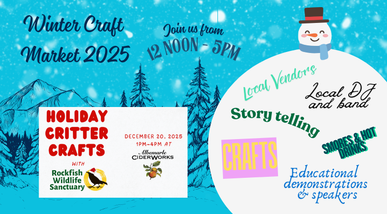 We invite everyone of all ages for festive fun and a warm welcoming atmosphere with friends and family this season. You will find Fun family activities, fine cider, mulled cider, hot chocolate, scheduled story reading, family activities, crafts with Rockfish Wildlife Sanctuary from 1pm & 4pm and fire pits to toast marshmallows for s'mores.